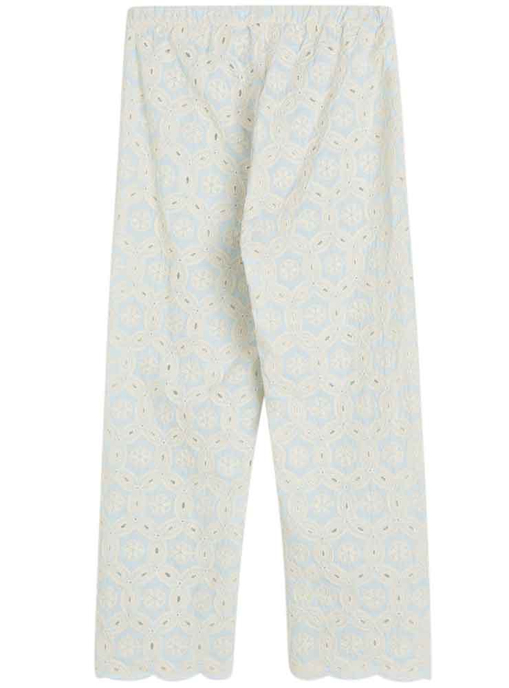 Designet har en lige pasform og en elastisk mellemhøj talje, som giver en komfortabel og fleksibel pasform. De lange ben afsluttes med en naturlig bølgekant, som fremhæver det broderede mønster og giver bukserne et feminint finish.