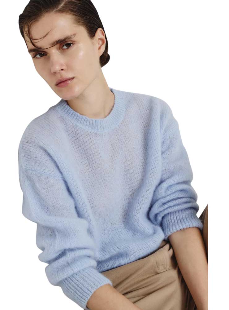 Oplev luksuriøs komfort med Pomandère Crew Neck in Mohair Sky Blue. Strikken er fremstillet i en eksklusiv mohairblanding, der giver en blød, let og varm kvalitet. Det klassiske crew neck-design skaber et tidløst udtryk, som gør den nem at style til både jeans, nederdele og skræddersyede bukser.